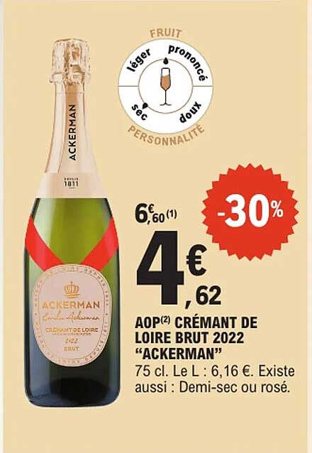 Découvrez dès maintenant la offre AOP(2) CRÉMANT DE LOIRE BRUT 2022 "ACKERMAN" dans le catalogue de E.Leclerc. Cette offre est valable du 25/02/2025 au 08/03/2025.