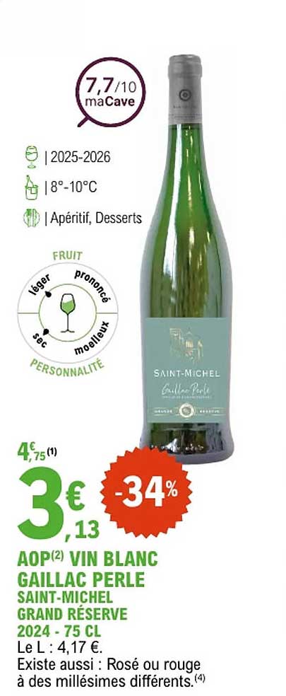 Découvrez dès maintenant la offre AOP(2) VIN BLANC GAILLAC PERLE SAINT-MICHEL GRAND RÉSERVE 2024 - 75 CL dans le catalogue de E.Leclerc. Cette offre est valable du 01/04/2025 au 12/04/2025.