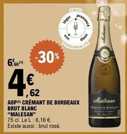 Découvrez la superbe offre de Aop(3) Crémant De Bordeaux Brut Blanc "Malesan" dans le nouveau catalogue de E.Leclerc. En plus de cette offre, vous trouverez de nombreuses autres réductions attrayantes. Vous pouvez facilement commander le Aop(3) Crémant De Bordeaux Brut Blanc "Malesan" en ligne via le site web de E.Leclerc ou l'acheter dans un magasin près de chez vous.