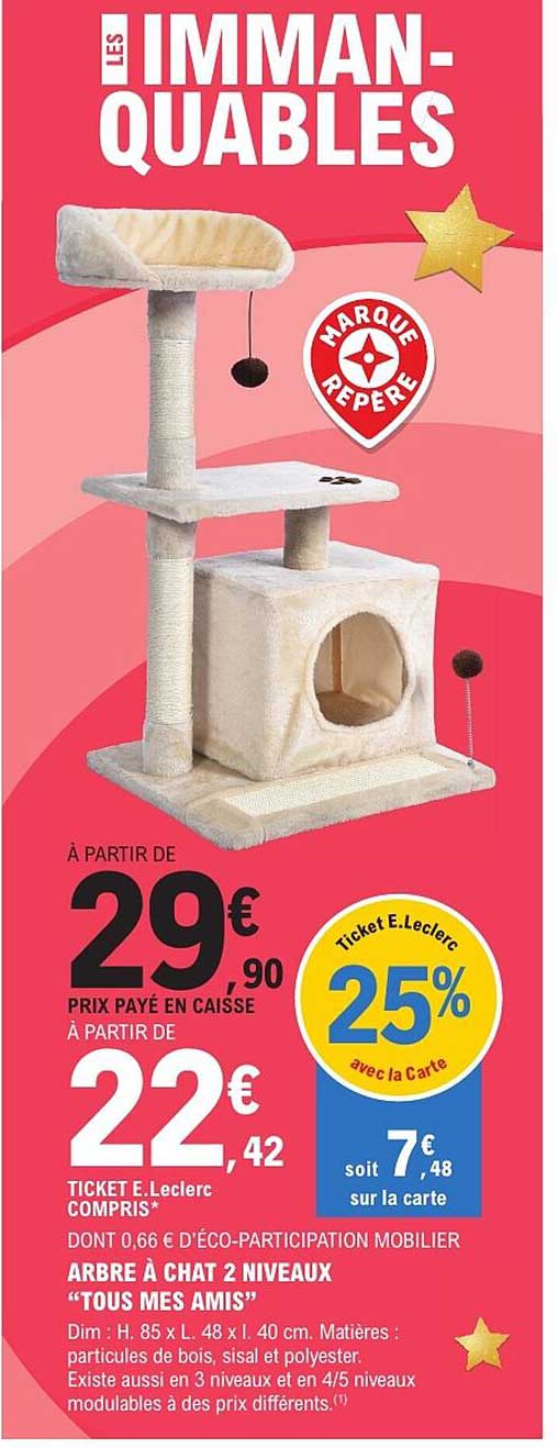 Découvrez l'offre de Arbre À Chat 2 Niveaux "Tous Mes Amis" chez E.Leclerc! Cette offre fantastique est maintenant disponible dans le nouveau catalogue de E.Leclerc. Profitez de cette occasion et économisez considérablement sur votre achat.