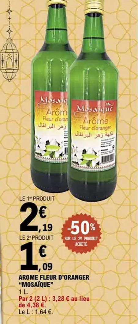 Découvrez l'offre de Arôme Fleur D'oranger "Mosaique" chez E.Leclerc! Cette offre fantastique est maintenant disponible dans le nouveau catalogue de E.Leclerc. Profitez de cette occasion et économisez considérablement sur votre achat.