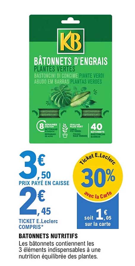 Découvrez l'offre de Bâtonnets D'engrais Plantes Vertes chez E.Leclerc! Cette offre fantastique est maintenant disponible dans le nouveau catalogue de E.Leclerc. Profitez de cette occasion et économisez considérablement sur votre achat.