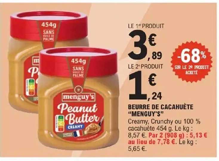 Découvrez une offre exceptionnelle sur le beurre de cacahuète "Menguy's", idéal pour tous les amateurs de cette délicieuse pâte. Du 25 mars au 5 avril 2025, profitez de tarifs incroyables qui vous permettront de régaler vos papilles sans vider votre porte-monnaie. Ce produit, haut en goût, est parfait pour vos toast, recettes de pâtisserie ou simplement à déguster à la cuillère !