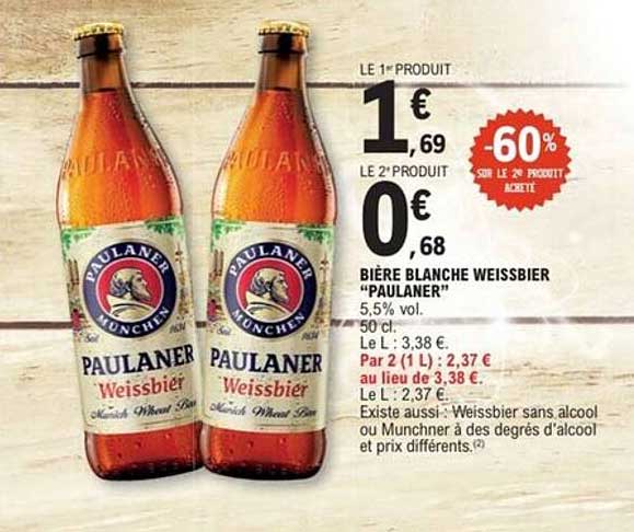 Découvrez l'incroyable promotion sur la bière blanche Weissbier “Paulaner”, une boisson parfaite pour vos moments de détente. Profitez d'une réduction exceptionnelle sur le deuxième produit acheté, ce qui en fait une offre à ne pas manquer. La Weissbier, avec ses arômes délicats et son goût rafraîchissant, est idéale pour accompagner vos repas estivaux ou vos apéritifs entre amis.