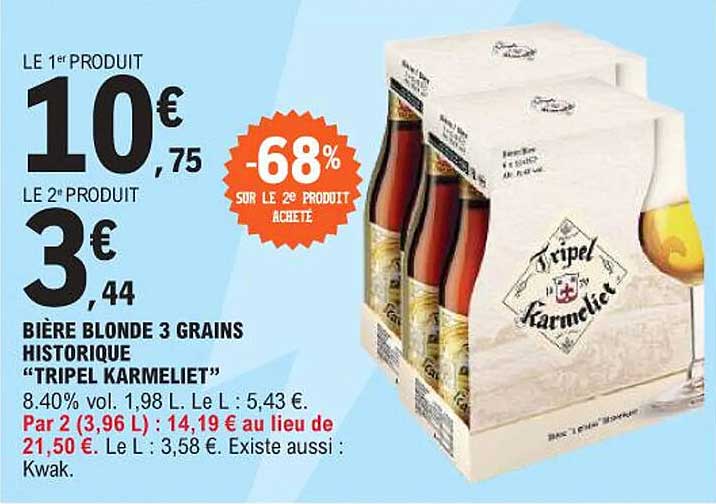 Découvrez l'offre de Bière Blonde 3 Grains Historique “Tripel Karmeliet” chez E.Leclerc! Cette offre fantastique est maintenant disponible dans le nouveau catalogue de E.Leclerc. Profitez de cette occasion et économisez considérablement sur votre achat.
