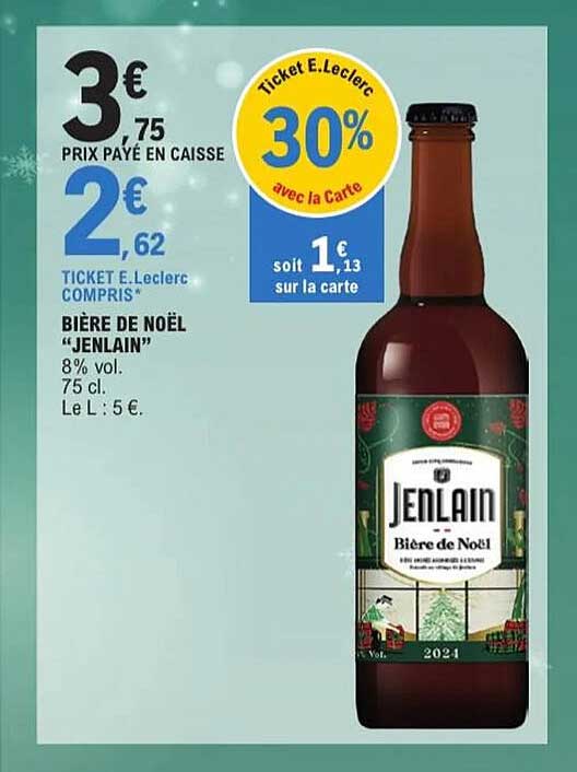 Découvrez l'offre de Bière De Noël "Jenlain" chez E.Leclerc! Cette offre fantastique est maintenant disponible dans le nouveau catalogue de E.Leclerc. Profitez de cette occasion et économisez considérablement sur votre achat.
