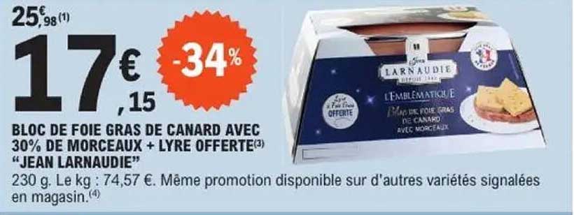 Offre de Bloc De Foie Gras De Canard Avec 30% De Morceaux + Lyre Offertes "Jean Larnaudie" chez E.Leclerc