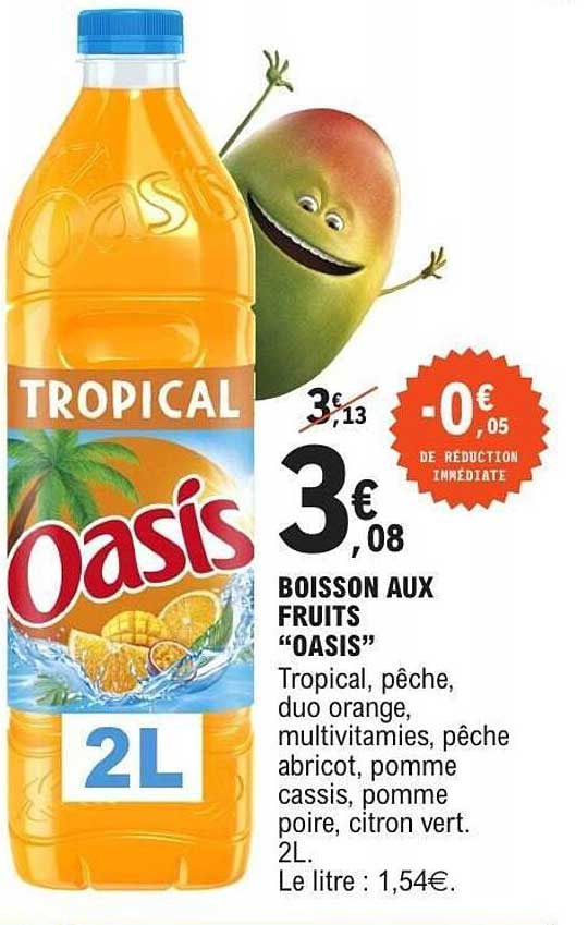 Découvrez l’offre spéciale sur la boisson aux fruits “Oasis” disponible en format 2L. Parfait pour les chaudes journées d'été ou pour accompagner vos repas, Oasis est un choix rafraîchissant qui plaira à toute la famille. Avec une saveur tropicale irrésistible et une touche de multivitamines, cette boisson est idéale pour s'hydrater tout en se régalant.