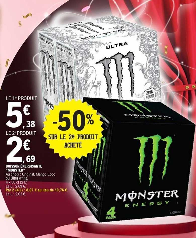 Découvrez une offre irrésistible sur les boissons énergisantes de la marque Monster. Pendant cette période de promotion, vous pouvez profiter de deux variétés : Original, Mango Loco ou Ultra White. C’est l’occasion parfaite de recharger vos batteries avec cette boisson pleine de peps !