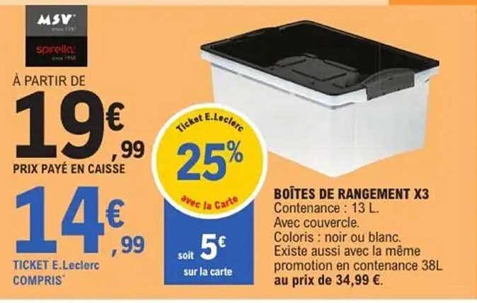 Découvrez l'offre de Boîtes De Rangement X3 chez E.Leclerc! Cette offre fantastique est maintenant disponible dans le nouveau catalogue de E.Leclerc. Profitez de cette occasion et économisez considérablement sur votre achat.