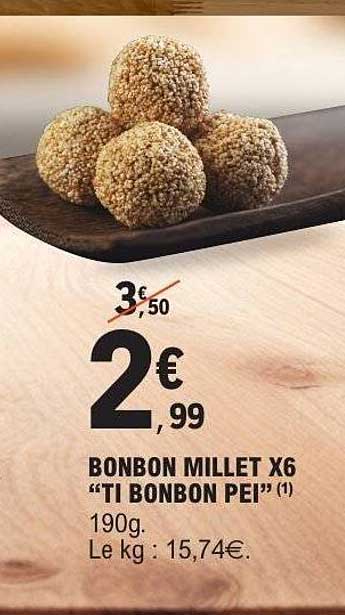 Découvrez dès maintenant la offre BONBON MILLET X6 "TI BONBON PEI!" dans le catalogue de E.Leclerc. Cette offre est valable du 04/11/2025 au 16/11/2025.