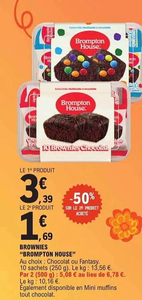 Découvrez les délicieux brownies "Brompton House" qui vont ravir les amateurs de chocolat. Avec une offre spéciale, ces douceurs sont parfaites pour toutes vos envies sucrées, que ce soit en dessert ou en collation. Profitez de cette promotion pour faire le plein de gourmandises !