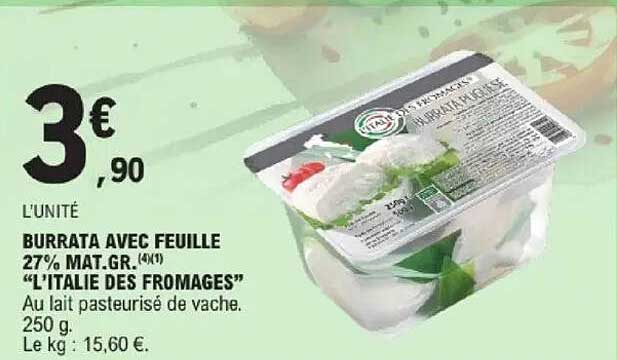 Vous êtes amateur de fromage ? Ne manquez pas cette occasion en or de découvrir la burrata avec feuille, une délicieuse spécialité italienne qui éveillera vos papilles. Proposé au prix incroyable de seulement 3,90 € l'unité, ce produit est non seulement savoureux, mais il offre également une expérience culinaire unique. Disponible du 7 au 18 octobre 2025, cette offre est à saisir sans tarder !