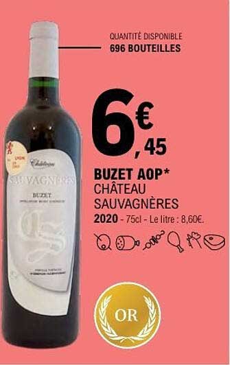 Découvrez dès maintenant la offre Buzet AOP* Château Sauvgnères 2020 dans le catalogue de E.Leclerc. Cette offre est valable du 21/10/2025 au 02/11/2025.