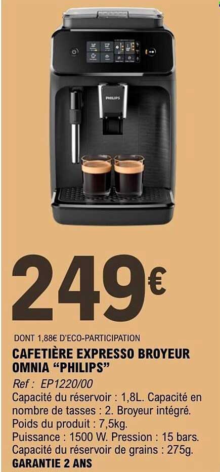 Découvrez la cafetière expresso broyeur OMNIA de PHILIPS, un incontournable pour les amateurs de café. Grâce à sa capacité de 1,8 L, elle est parfaite pour préparer vos délicieuses boissons au quotidien, que ce soit pour un café corsé le matin ou un expresso savoureux après le repas. Cette machine apportera une touche professionnelle à votre cuisine tout en étant facile à utiliser.