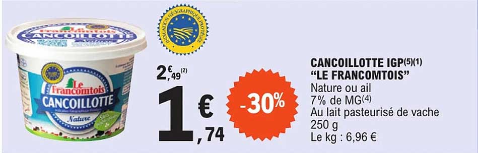 Découvrez dès maintenant la offre Cancoillotte IGP "Le Francmontois" dans le catalogue de E.Leclerc. Cette offre est valable du 08/10/2024 au 12/10/2024.