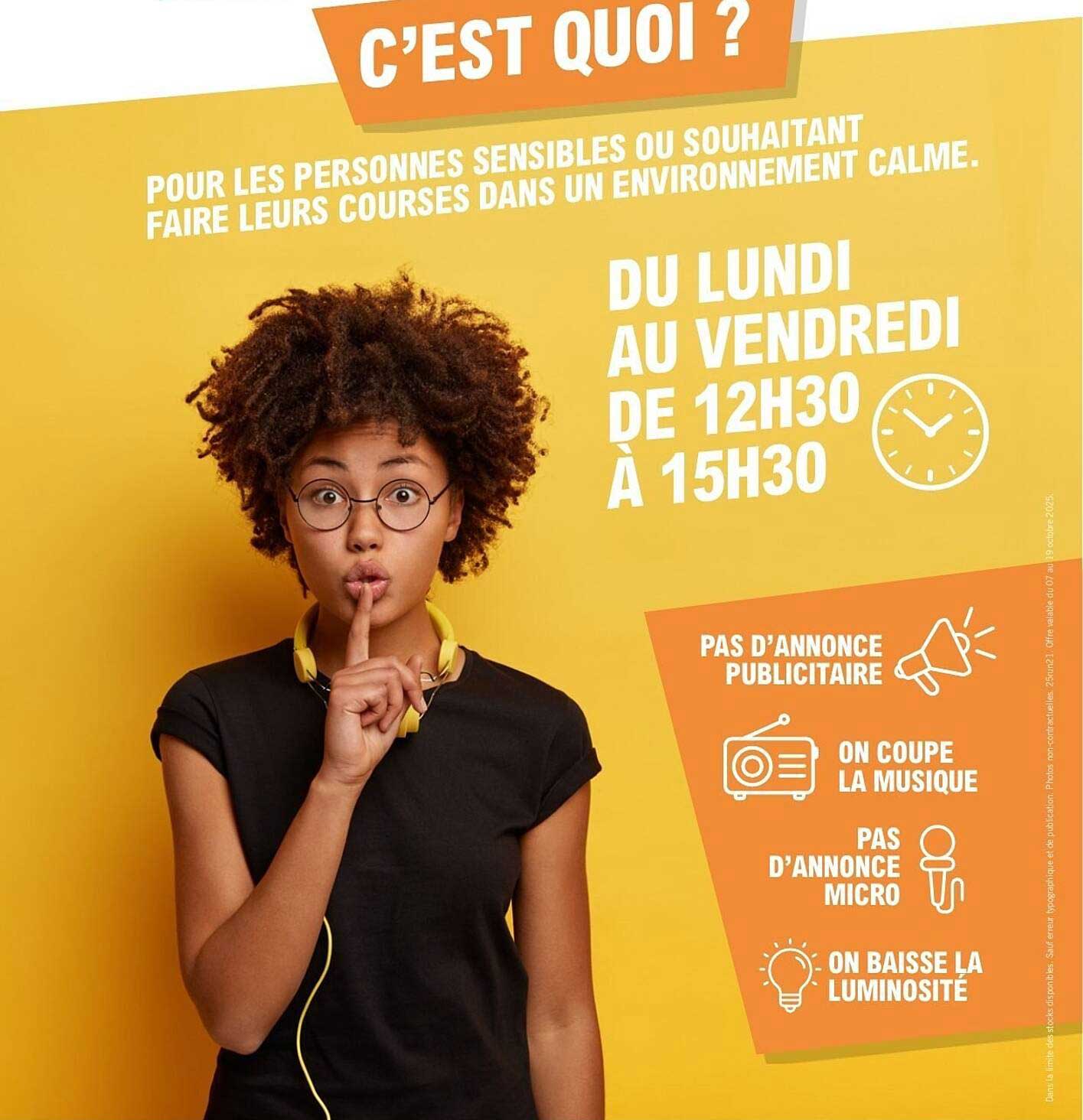 Cette offre est disponible du lundi au vendredi, de 12h30 à 15h30. Pendant ce créneau, les annonces publicitaires sont supprimées, la musique est coupée, et la luminosité est réduite pour favoriser un cadre relaxant. Vous profitez ainsi d'une ambiance propice aux courses tranquilles.