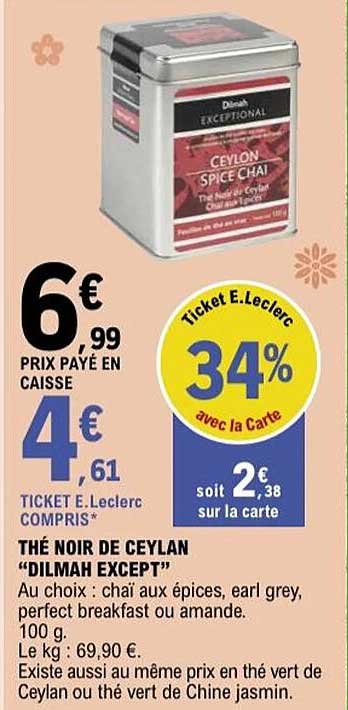 Découvrez l'offre de Ceylon Spice Chai chez E.Leclerc! Cette offre fantastique est maintenant disponible dans le nouveau catalogue de E.Leclerc. Profitez de cette occasion et économisez considérablement sur votre achat.