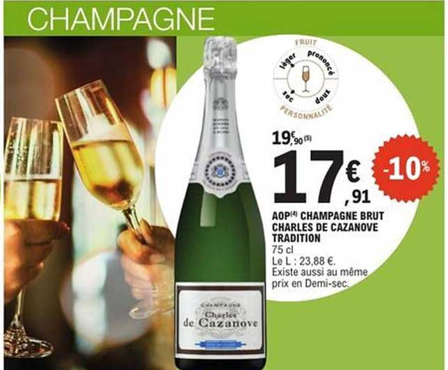 Découvrez une excellente opportunité pour célébrer vos moments spéciaux avec le Champagne Brut Charles de Cazanove Tradition. Profitez d'une réduction de 10% sur cet emblématique vin effervescent, parfait pour toutes les occasions festives. Disponible du 21 au 30 octobre 2025, cette offre est à ne pas manquer !