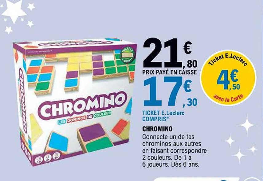 Découvrez dès maintenant la offre CHROMINO Les dominos de couleur dans le catalogue de E.Leclerc. Cette offre est valable du 18/10/2024 au 22/12/2024.