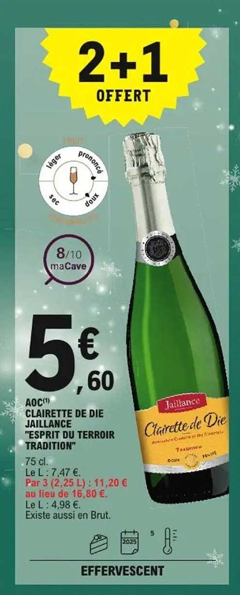 Découvrez dès maintenant la offre Clairette de Die Jaillance "Esprit du Terroir Tradition" dans le catalogue de E.Leclerc. Cette offre est valable du 10/12/2024 au 24/12/2024.