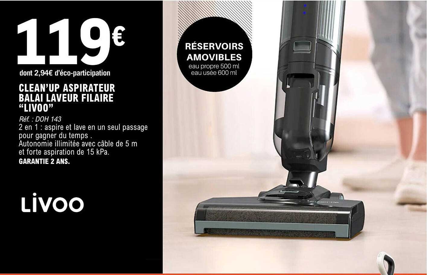 Découvrez l'aspirateur balai laveur filaire Livoo, une solution innovante pour un nettoyage efficace et rapide de votre intérieur. Avec sa fonction 2 en 1, cet appareil aspire et lave en un seul passage, vous permettant de gagner un temps précieux lors de votre ménage. Cette offre est valable du 7 au 19 octobre 2025, alors ne laissez pas passer cette occasion !