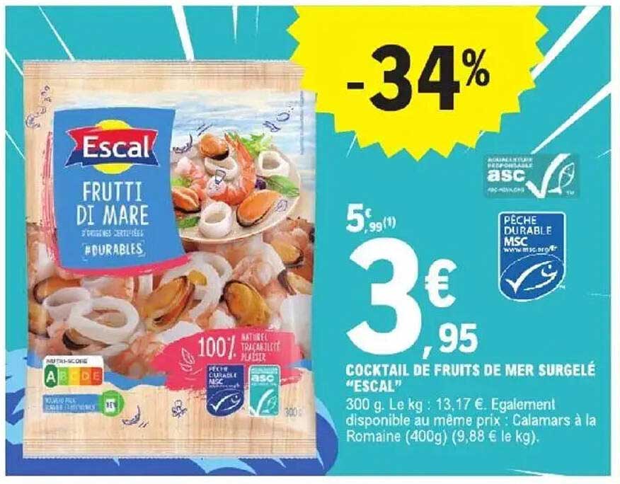 Découvrez l'offre de Cocktail De Fruits De Mer Surgelé "Escal" chez E.Leclerc! Cette offre fantastique est maintenant disponible dans le nouveau catalogue de E.Leclerc. Profitez de cette occasion et économisez considérablement sur votre achat.