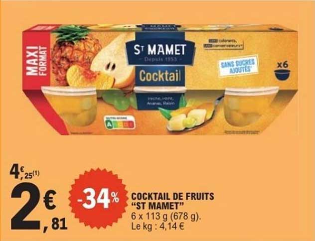 Découvrez le délicieux Cocktail de Fruits “St Mamet”, composé d’un mélange savoureux d’ananas, de pêche, d’abricot et de raisin. Avec cette promotion exceptionnelle, il n’a jamais été aussi simple de se faire plaisir tout en gardant une alimentation équilibrée ! Cette offre est valable jusqu'au 18 octobre 2025, alors ne tardez pas !