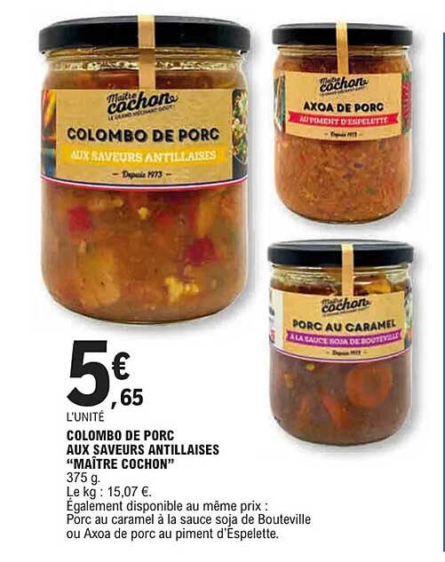 Offre de Colonbo De Porc Aux Saveurs Antillaises "Maître Cochon" Axoa De Porc Au Piment D'espelette Porc Au Caramel À La Sauce Soja De Bouteille chez E.Leclerc