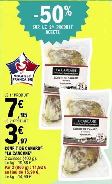 Découvrez dès maintenant la offre CONFIT DE CANARD "LA CANCANE" dans le catalogue de E.Leclerc. Cette offre est valable du 21/10/2025 au 01/11/2025.