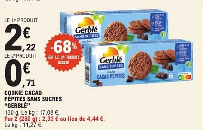 Découvrez l'offre exceptionnelle sur les cookies cacao pépites sans sucres de Gerblé. Parfaits pour une petite douceur sans culpabilité, ces cookies sont idéaux pour accompagner vos pauses gourmandes. Avec une réduction de 68 % sur le deuxième produit acheté, c'est une super occasion de faire le plein de plaisir tout en prenant soin de votre santé.