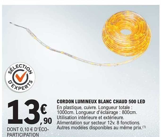 Découvrez dès maintenant la offre CORDON LUMINEUX BLANC CHAUD 500 LED dans le catalogue de E.Leclerc. Cette offre est valable du 04/11/2025 au 15/11/2025.