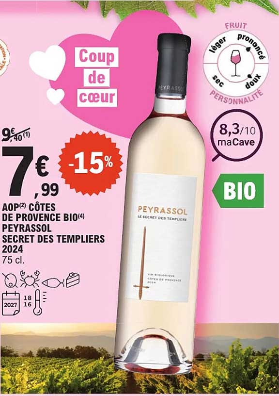 Découvrez l’AOP Côtes de Provence BIO Peyrassol, un vin exceptionnel qui ravira vos papilles. Profitez d'une réduction de 15 %, applicable du 8 au 19 avril 2025. Ce vin, élaboré dans le respect de l'environnement, est une véritable invitation à la découverte des saveurs de la Provence.