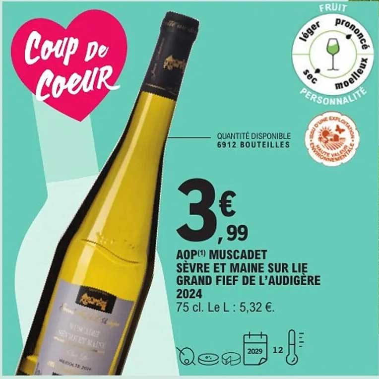 Découvrez ce vin AOP Muscadet Sèvre et Maine sur Lie, provenant du Grand Fief de l'Auditière, à un prix exceptionnel de seulement 3,99 €. Cette promotion est valable jusqu'au 11 octobre 2025, alors ne manquez pas l'occasion de l'ajouter à votre collection de vins.