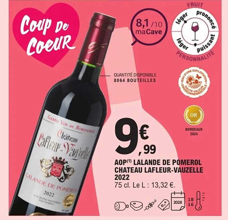 Découvrez le Château Lafleur-Vauzelle, un vin AOP Lalande de Pomerol 2022, qui se distingue par sa qualité et son caractère. Actuellement proposé à un prix exceptionnel, c'est l'occasion rêvée d'enrichir votre cave avec un cru digne des plus grands repas.