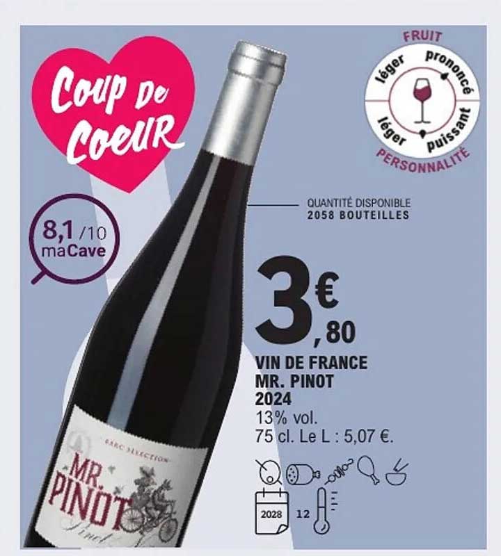 Découvrez le vin Mr. Pinot 2024, une réelle pépite qui ravira les palais les plus exigeants. Ce vin de France, noté 8,1/10 par maCave, est un choix parfait pour vos repas en famille ou entre amis. Profitez de cette offre exceptionnelle, disponible uniquement sur cette page.