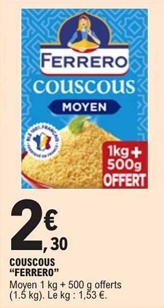 Découvrez une offre irrésistible sur le couscous Ferrero, qui vous propose 1 kg de couscous premium accompagné de 500 g offerts. Une opportunité parfaite pour agrémenter vos plats tout en réalisant des économies substantielles.