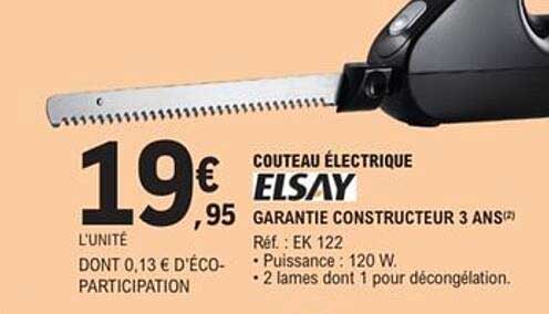 Découvrez dès maintenant la offre Couteau Électrique ELSAY dans le catalogue de E.Leclerc. Cette offre est valable du 21/10/2025 au 30/10/2025.
