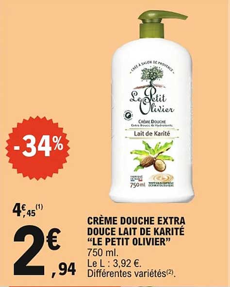 Offre de Crème Douche Extra Douce Lait De Karité "Le Petit Olivier" chez E.Leclerc