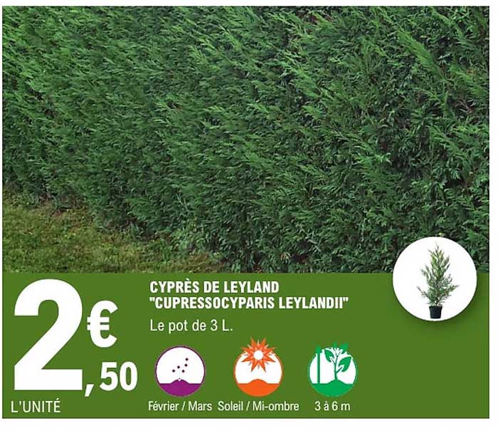 Découvrez l'offre de Cyprès De Leyland "Cupressocyparis Leylandii" chez E.Leclerc! Cette offre fantastique est maintenant disponible dans le nouveau catalogue de E.Leclerc. Profitez de cette occasion et économisez considérablement sur votre achat.