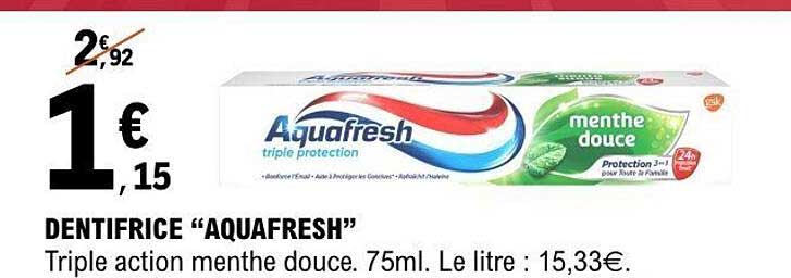Découvrez dès maintenant la offre DENTIFRICE "AQUAFRESH" dans le catalogue de E.Leclerc. Cette offre est valable du 23/09/2025 au 05/10/2025.