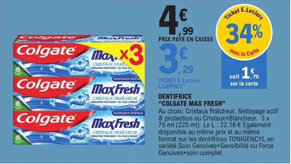 Découvrez l'offre de Dentifrice "Colgate Max Fresh" chez E.Leclerc! Cette offre fantastique est maintenant disponible dans le nouveau catalogue de E.Leclerc. Profitez de cette occasion et économisez considérablement sur votre achat.