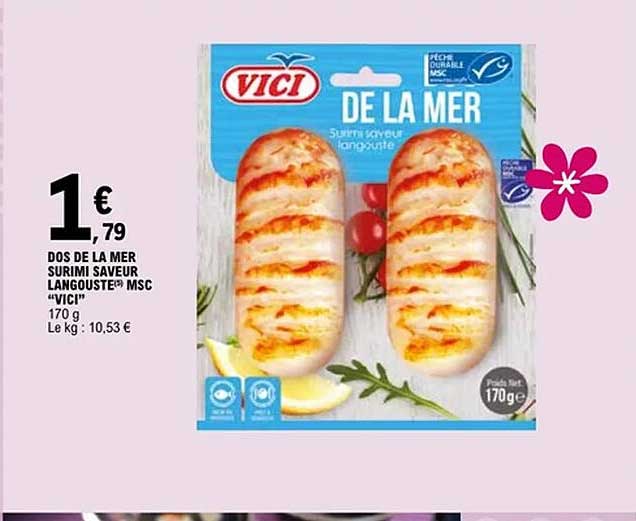 Découvrez dès maintenant la offre DOS DE LA MER SURIMI SAVEUR LANGOUSTE® MSC "VICI" dans le catalogue de E.Leclerc. Cette offre est valable du 15/04/2025 au 19/04/2025.