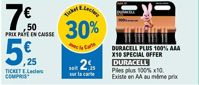 Découvrez l'offre de Duracell Plus 100% Aaa X10 Special Offer chez E.Leclerc! Cette offre fantastique est maintenant disponible dans le nouveau catalogue de E.Leclerc. Profitez de cette occasion et économisez considérablement sur votre achat.