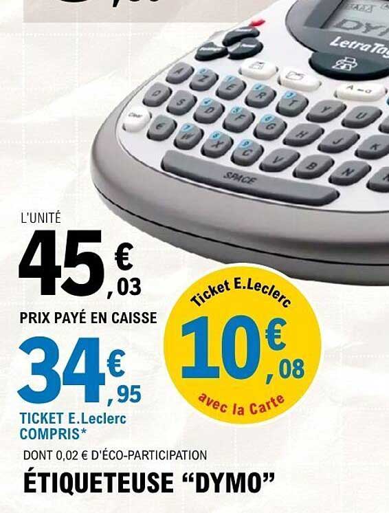 Découvrez dès maintenant la offre ÉTIQUETEUSE “DYMO” dans le catalogue de E.Leclerc. Cette offre est valable du 08/07/2025 au 03/08/2025.