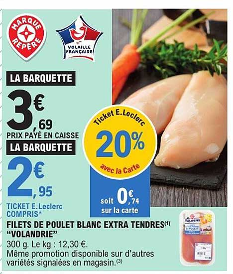 Découvrez l'offre de Filets De Poulet Blanc Extra Tendres(*) "Volandrie" chez E.Leclerc! Cette offre fantastique est maintenant disponible dans le nouveau catalogue de E.Leclerc. Profitez de cette occasion et économisez considérablement sur votre achat.