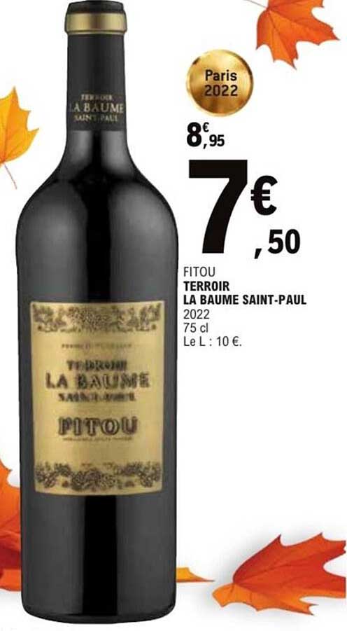 Découvrez l'offre de Fitou Terroir La Baume Saint-Paul 2022 chez E.Leclerc! Cette offre fantastique est maintenant disponible dans le nouveau catalogue de E.Leclerc. Profitez de cette occasion et économisez considérablement sur votre achat.