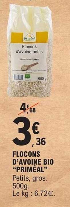 Découvrez une offre irrésistible sur les flocons d’avoine bio “PRIMÉAL” ! Parfaits pour vos petits déjeuners équilibrés ou vos recettes santé, ces flocons d’avoine, conditionnés en sachet de 500g, sont à un prix exceptionnel du 2025-11-04 au 2025-11-16. Ne manquez pas cette opportunité d’intégrer un aliment nutritif dans votre quotidien.