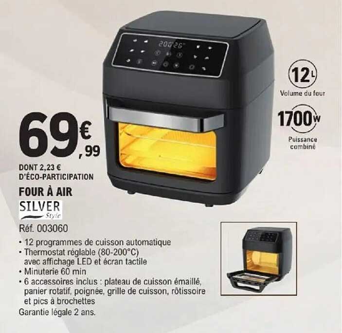 Actuellement, le four à air SILVER est proposé au prix exceptionnel de 69,99 €, dont 2,23 € d’éco-participation. Avec des économies importantes par rapport au prix habituel, c'est le moment de sauter sur cette occasion !