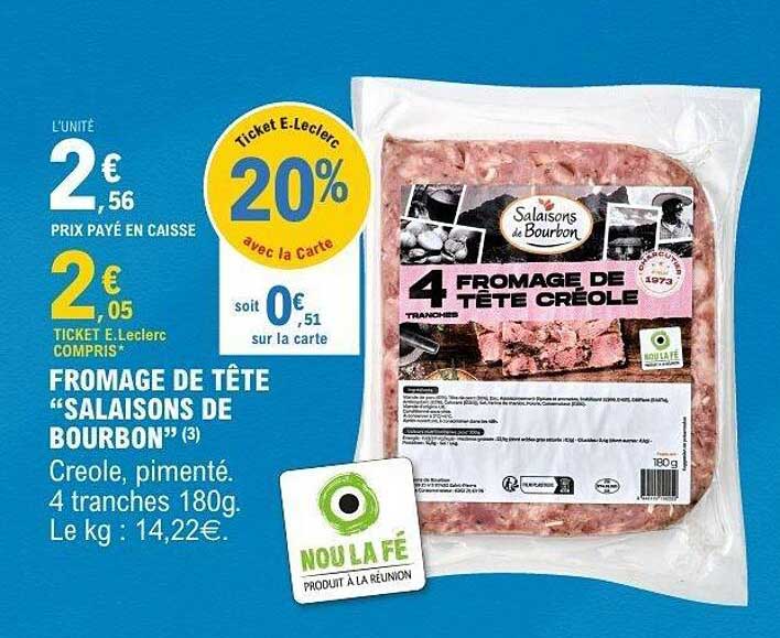 Découvrez le fromage de tête "Salaisons de Bourbon", un délice créole qui ravira vos papilles. Profitez d'une promotion exceptionnelle sur ce produit unique, valable du 2025-11-04 au 2025-11-16. Ce fromage, avec son goût pimenté, sera l'allié parfait de vos apéritifs et plats typiques.